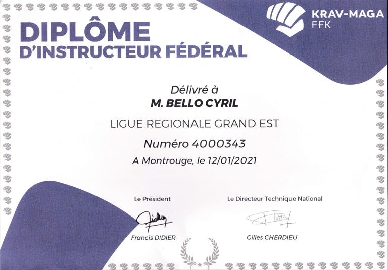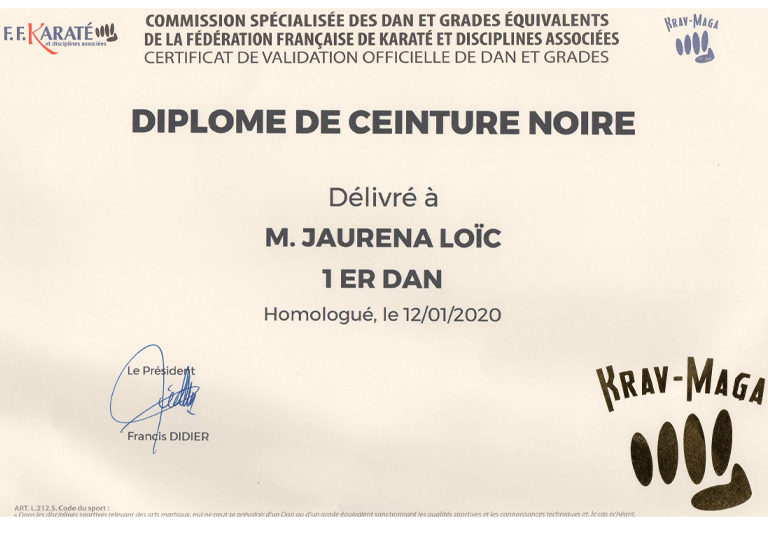 Vous retrouverez le grade et le diplôme spécifique pour la discipline KRAV-MAGA sur le site de la fédération française de karaté et disciplines associées (FFKDA) seule fédération déléguée par le ministère jeunesse et sports pour organiser la pratique et décernée des diplômes d’état.